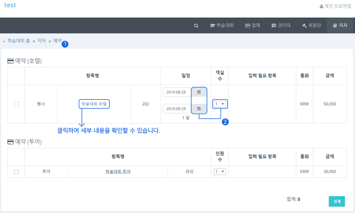 ❶ 예약(Reservation) 메뉴에서는 해당 학술대회의 호텔 및 투어 예약을 선택하여 결제할 수 있습니다.