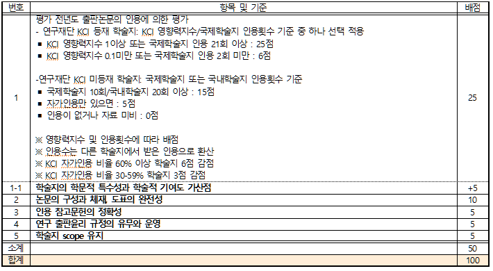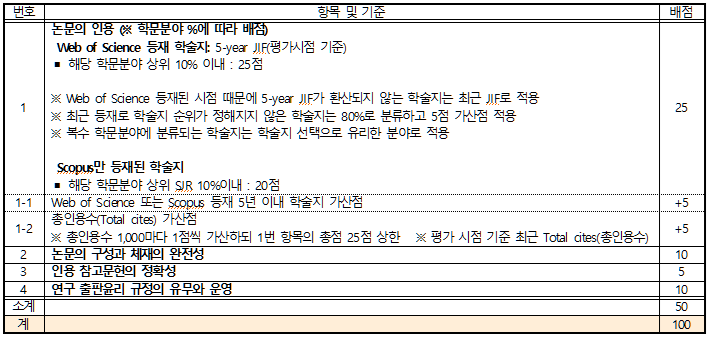 한국과학기술총연합회에서는 아래의 표와 같이 국내와 국제로 나누어 심사 항목 및 기준을 공시하였습니다.