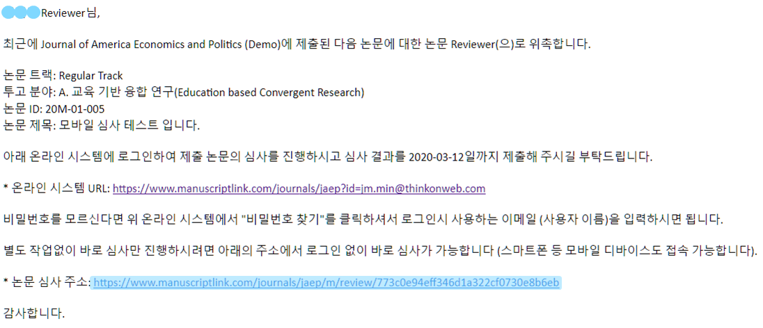 씽크온웹의 온라인 투고 시스템내에서 심사가 할당된 심사자는 다음과 같은 이메일을 받게됩니다.