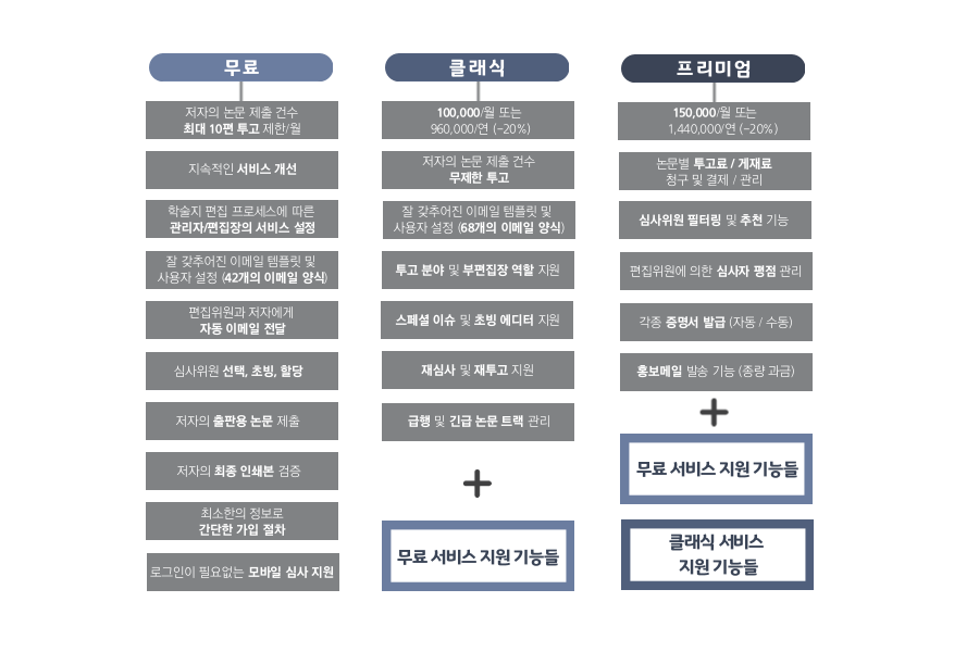 씽크온웹의 저널 서비스는 무료, 클래식, 프리미엄의 3가지 유형으로 이용이 가능합니다.