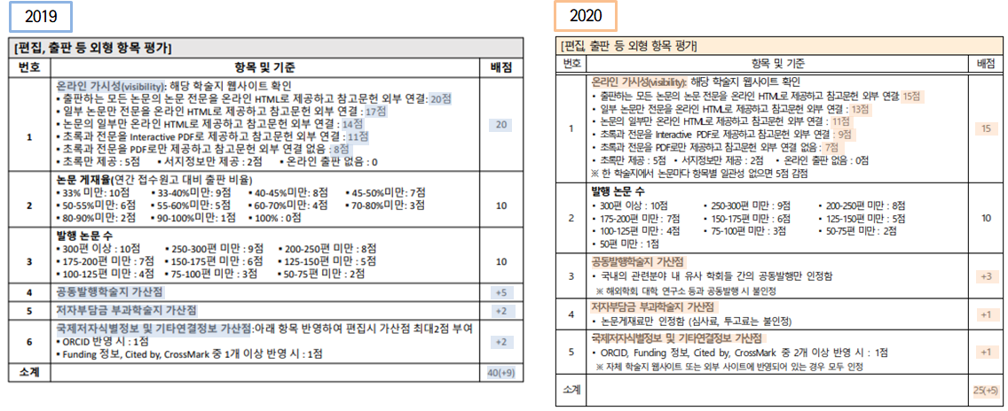 2019년에 비해 2020년에 가장 눈에 띄게 변화한 항목은 국내 학술지 평가가 전년도 KCI 등재와 미등재로 구분되어 심사가 이루어지는 것과 온라인 가시성 배점의 감소, 연구윤리 규정의 유무와 운영의 배점이 증가하였다는 것입니다.