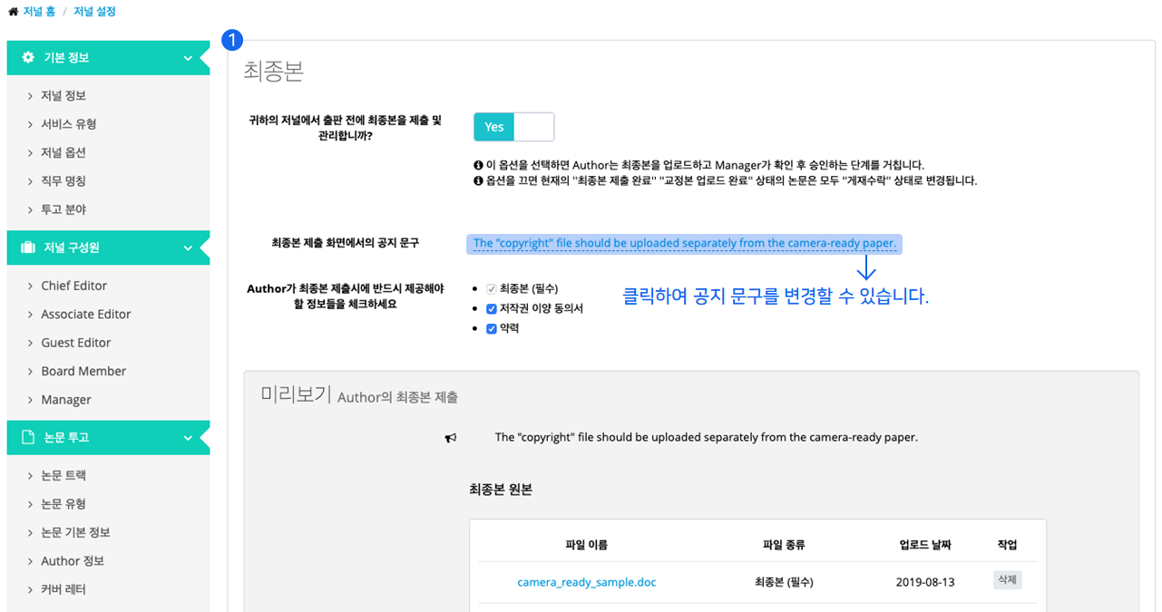 ❶ 최종본 메뉴에서는 저자가 최종본을 제출할 때 공지 문구를 설정하거나 필수로 제출해야 하는 항목을 설정할 수 있습니다.
