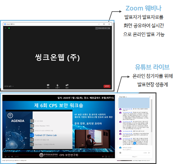 씽크온웹에서 진행하고 있는 온라인 학술대회의 종류는 온라인 학술대회, 온오프라인 학술대회, 오프라인 학술대회 행사지원 크게 3가지로 나눌 수 있습니다. 그중 온오프라인 학술대회와 오프라인 학술대회 행사지원은 실시간으로 진행되는 행사를 유튜브로 실시간 스트리밍 하거나, ZOOM 웨비나를 이용하여 실시간 온라인 발표를 하는 방식으로 진행됩니다.