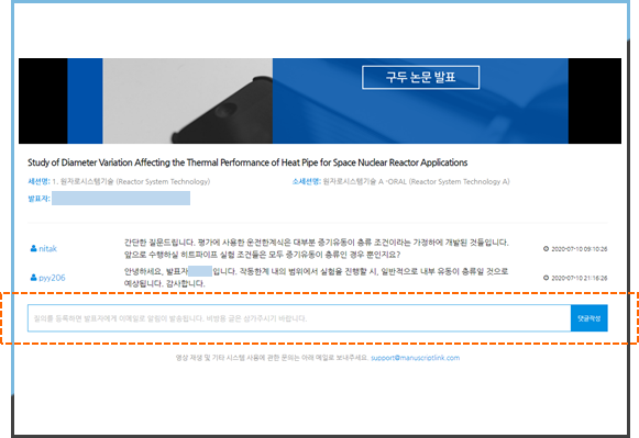 발표 영상 화면에 추가된 실시간 댓글 기능으로 발표를 시청하며 질의 사항을 댓글로 작성시 해당 발표자에게 메일이 발송됩니다.