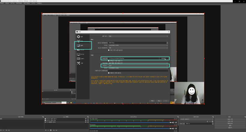 녹화를 시작하기 전 먼저 상단 탭의 파일을 클릭한 후 설정에 들어가고, 녹화 파일의 저장 위치와 영상의 형식(영상의 형식은 반드시 MP4로 설정)을 설정합니다.