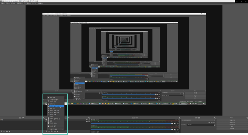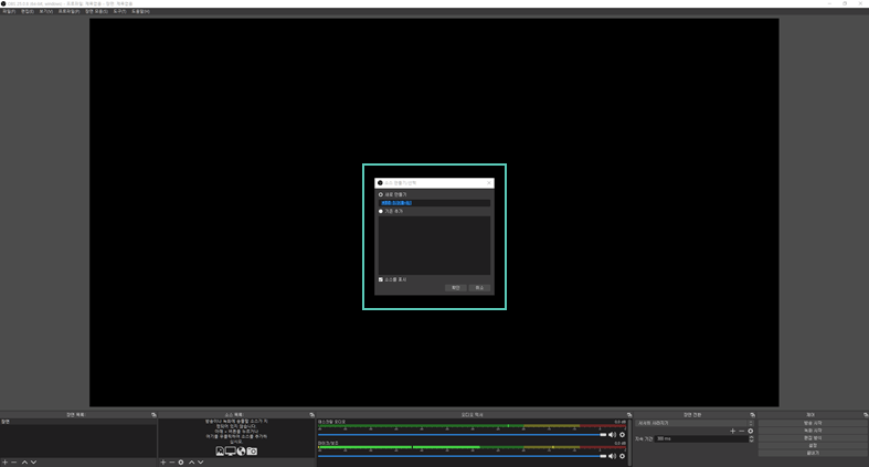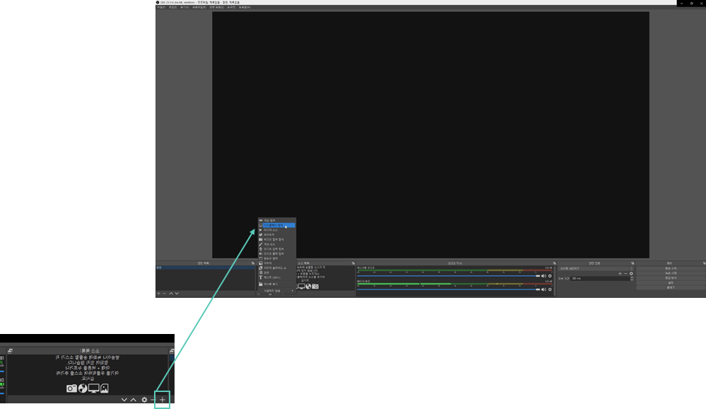 웹캠(얼굴이 나오는 화면) 화면을 만들기 위해 하단의 플러스 버튼을 클릭하여 비디오 캡쳐 장치를 클릭합니다.