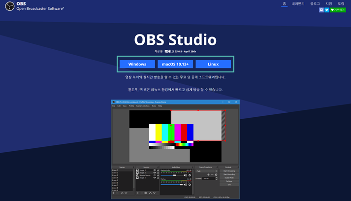 OBS Studio 홈페이지(https://obsproject.com/ko)에서 원하는 형식으로 다운로드 합니다.