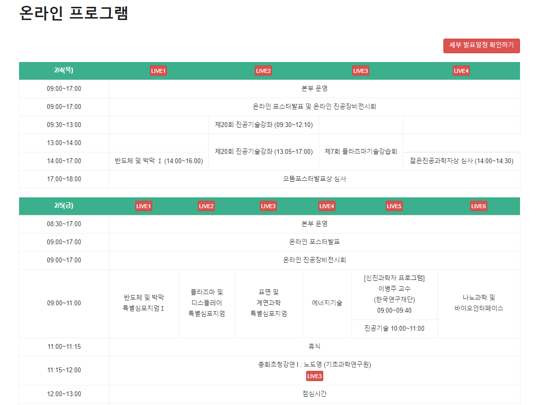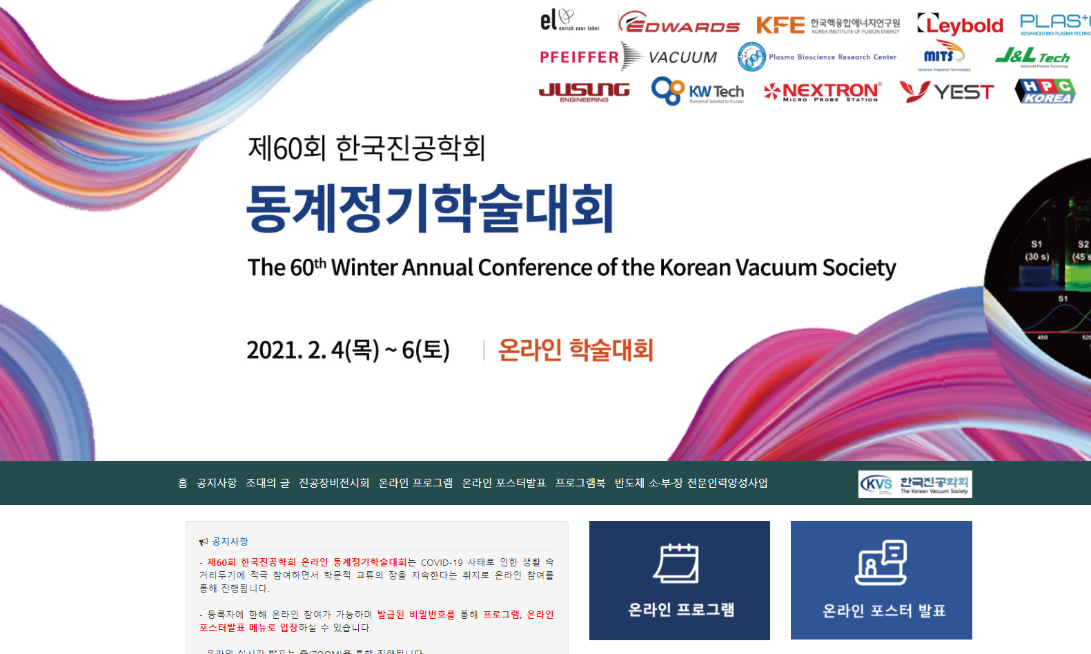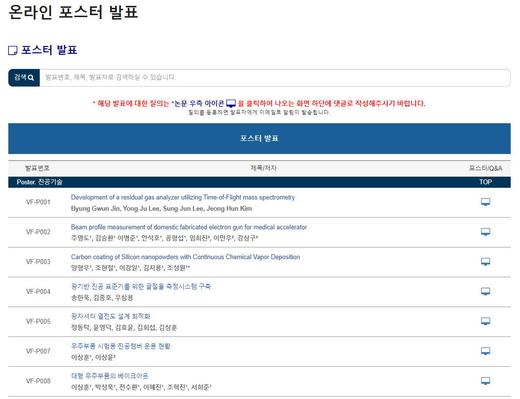 해당 학술대회는 기본 홈페이지에 진공장비전시회, 반도체 소·부·장 전문인력양성사업 메뉴를 추가한 온라인 학술대회 행사이며, 구두발표 및 강좌는 각자 장소에서 줌에 접속하여 진행되었습니다.