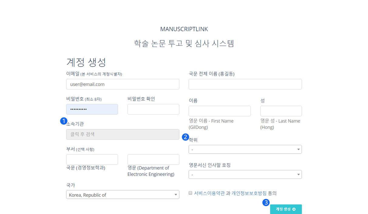 ❶ 소속기관은 ‘클릭 후 검색’ 창을 클릭하고 영문으로 검색하여 지정합니다.