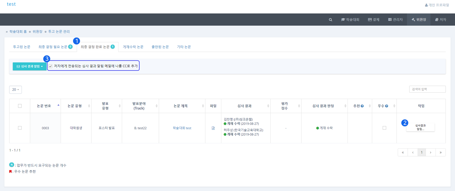 ❶ 최종 결정 완료 논문(Decision completed) 탭에서는 최종적으로 심사가 완료된 논문을 관리할 수 있습니다.